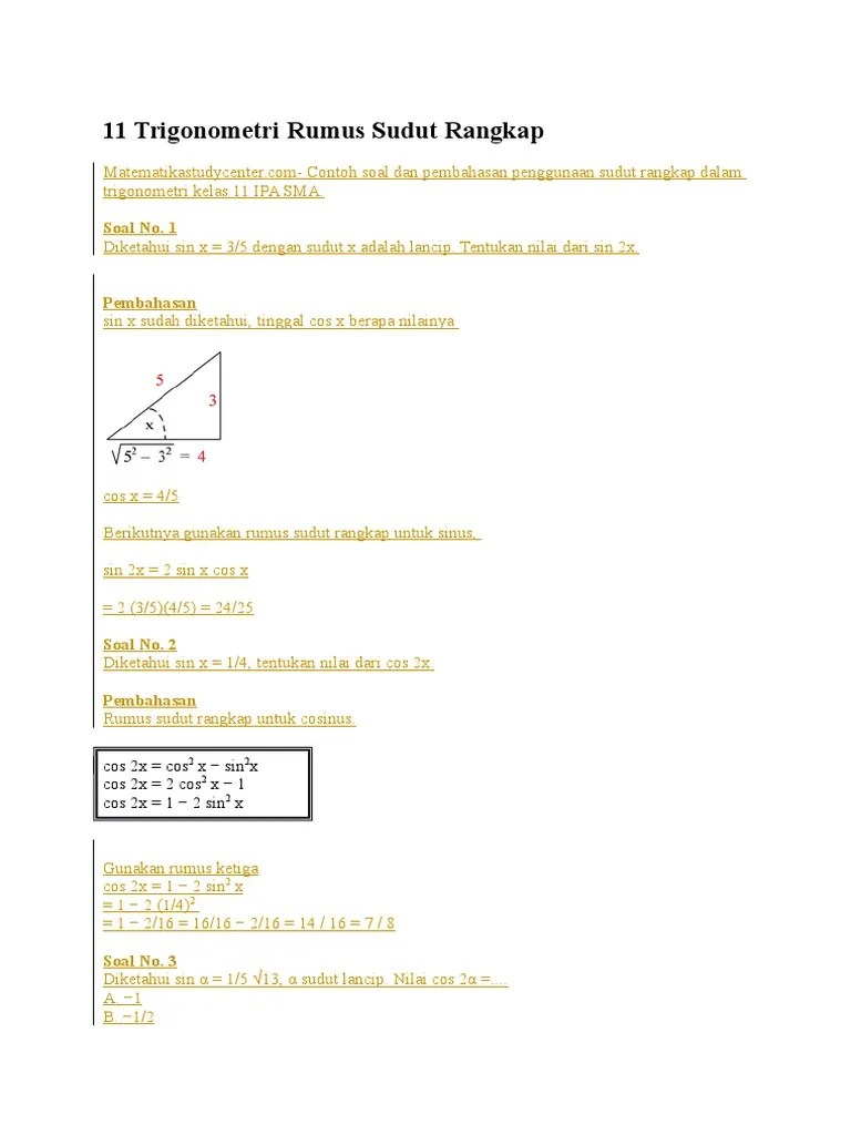 Contoh soal trigonometri sudut rangkap. Tugas terstruktur dosen pengampu trigonometri nunung rahimah, m. Rumus trigonometri jumlah dan selisih dua sudut dapat digunakan untuk menentukan nilai perbandingan tirgonometri suatu sudut yang tidak diketahui misalnya kita dapat menentukan nilai sinus dari sudut 165 o dengan menggunakan rumus jumlah dua sudut istimewa yaitu 120 o 45 o. S i n x c o s x. Berikut ini adalah rangkuman rumus rumus trigonometri rumus identitas, sudut rangkap lengkap untuk catatan mengerjakan soal.